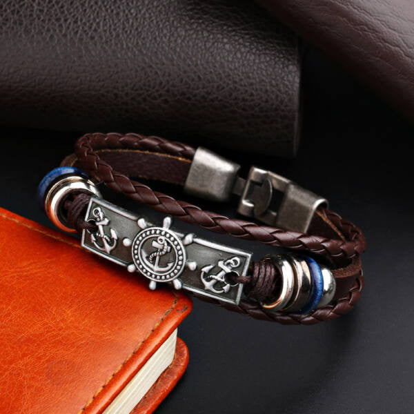 Bőr-nemesacél hajós karkötő barna