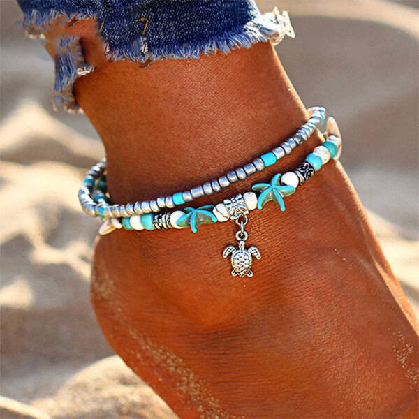 A dupla tengeri csillagos bokalánc egy gyönyörű és különleges ékszerdarab, amely tökéletes kiegészítője lehet bármilyen öltözéknek. A bokalánc két soros elrendezésű, tengeri csillagok, apró kövecskék, és egy teknős medál díszítik, melyek különlegessé varázsolják lábad megjelenését. A tengeri csillagok klasszikus és időtlen motívumok, amelyek mindig divatosak maradnak.